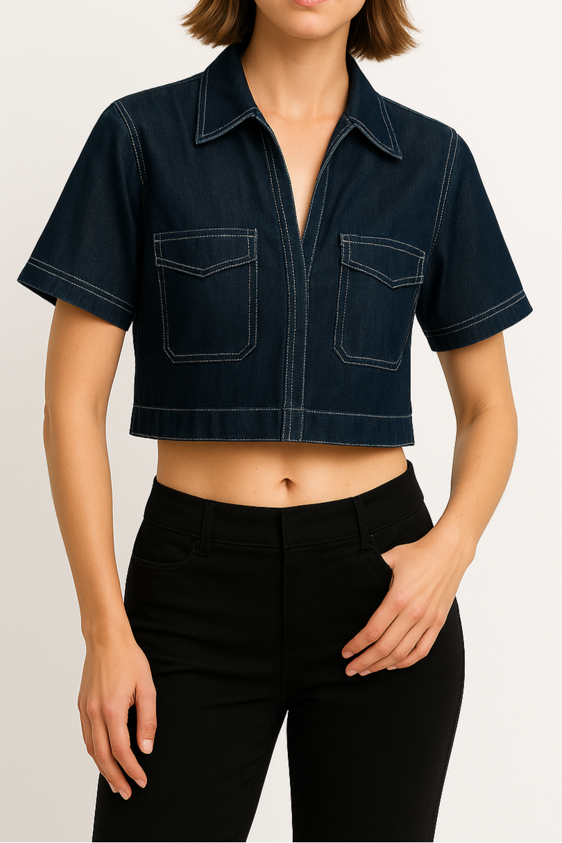 Effortlessly balancing structure and style, the Arden Cropped Denim Shirt in Midnight Indigo is a fresh take on the classic denim staple. Crafted from premium cotton denim with contrast stitching, it features a sharp collared neckline, short sleeves, and two front flap pockets for a utility-inspired edge. The cropped silhouette adds a modern twist, making it a versatile piece for casual weekends or elevated streetwear looks.