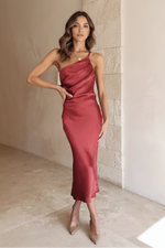 Unit price perThe Elena Midi Dress brings a refined, sculptural elegance to eveningwear. Crafted from a luxe satin fabrication with a luminous sheen, this piece features a modern one-shoulder neckline and subtle pleating that gracefully contours the bust. A softly fitted silhouette falls to a sleek midi length, while the delicate dual-strap open back adds an unexpected touch of allure. Designed for weddings, cocktail evenings or elevated celebrations — it's timeless with a modern twist.