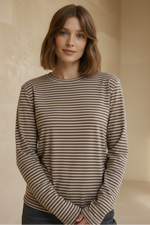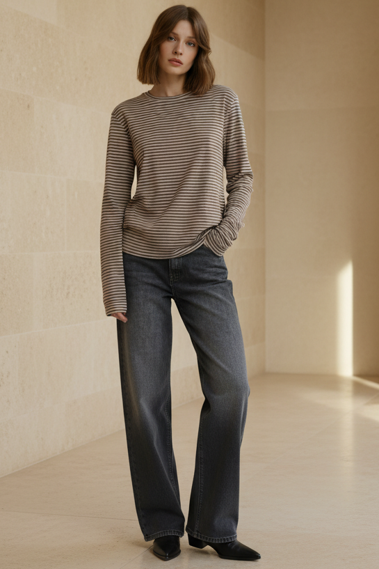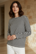 Pair this Stripe Tee with tailored white jeans and loafers for a clean, coastal-inspired daytime look. For an elevated casual vibe, tuck it into high-rise trousers and layer under a blazer or trench — ideal for office days or weekend brunches.