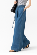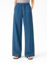 Unit price perThe Arden Wide-Leg Denim Pants offers a modern twist on a timeless classic. Crafted from a breathable fabric with a hint of lyocell for softness, these pants feature a relaxed wide-leg silhouette and a mid-rise elastic waistband with adjustable drawstring for ease. Lightweight yet structured, they bring casual sophistication to everyday dressing.