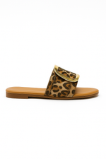 Step into effortless style with the Elvira Luxe Slide Sandals, a refined blend of comfort and sophistication. Crafted from high-quality leopard-print fabric, these sandals feature an eye-catching gold buckle detail that elevates their modern, minimalist silhouette. Perfect for both sunny days and laid-back evenings, they offer a chic way to embrace a touch of wild elegance.